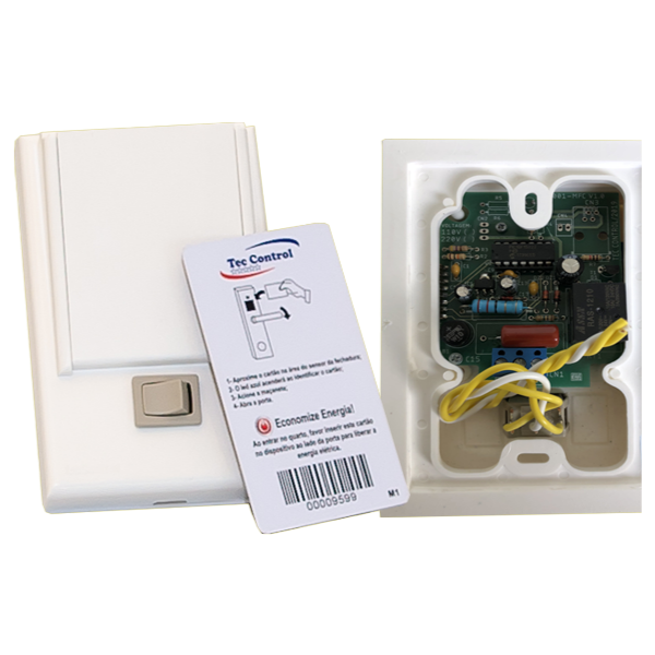 Quando o dispositivo acionador (cartão RFID ou cartão de tarja magnética) é removido do economizador de energia, em até 1 minuto a energia elétrica é interrompida nos circuitos elétricos pré-definidos durante a instalação.